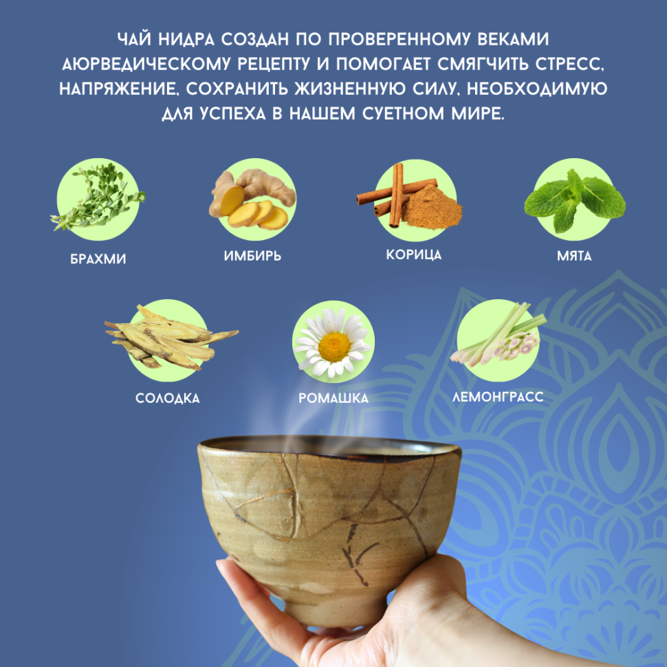 Чайная композиция «Нидра» содержит богатый букет целебных аюрведических трав, среди которых: Ромашка - издавна известная своими успокаивающими свойствами; Брами - прекрасное средство, тонизирующее мозговую активность и повышающее интеллект, а также: Имбирь, Лемонграсс, Пудина, Яштимадху и Коричник.
