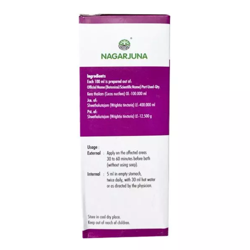 Противопоказания: Индивидуальная непереносимость компонентов. Способ: Нанесите масло на поражённый участок за 30 - 60 минут до душа. Смывайте без применения мыла! Дважды в день в течение трех месяцев смазывать проблемные места. Отказаться на время лечения от кислой, жаренной, острой пищи. Состав : Масло райтии красильной (Wrightia tinctoria), кокосовое масло (cocos nucifera). Производитель : Nagarjuna Ayurvedic Group, Индия. Объём: 100 мл.